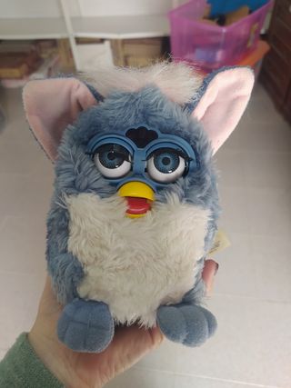 Este es un muñeco Furby interactivo de color azul. - Peluche suave y de voz amorosa. - Orejas rosas. - Ojos grandes y expresivos. - Pico amarillo. - Funciona perfectamente.