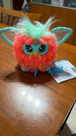 Furby interactivo de colores vibrantes, con ojos grandes y expresivos y orejas distintivas. - Pelaje suave y esponjoso. - Colores: naranja, rosa y turquesa. - Incluye accesorio tipo peine.