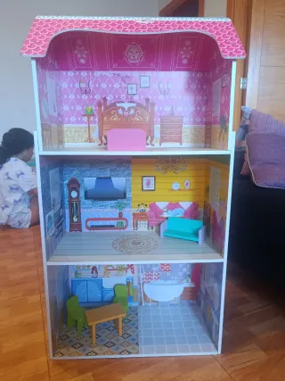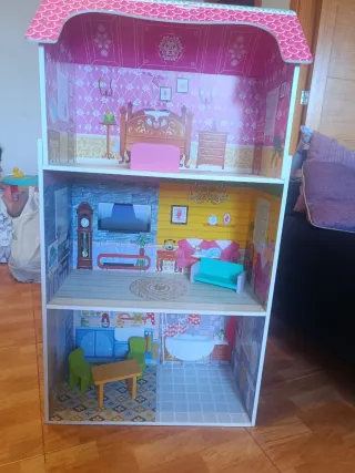 Casa de muñecas de madera de tres plantas, con un diseño detallado y colorido. - Techo a dos aguas con detalles rosas. - Primera planta: dormitorio con cama, mesita de noche y armario. - Segunda planta: salón con sofá, mesa auxiliar y chimenea. - Tercera planta: cocina con muebles y baño con bañera.
