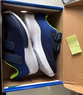 Zapatos deportivos para niños en color azul, talla 27. Cuentan con cierre de velcro para un ajuste fácil. - Diseño moderno con detalles en verde lima. - Suela blanca y flexible. - Material exterior de malla transpirable.