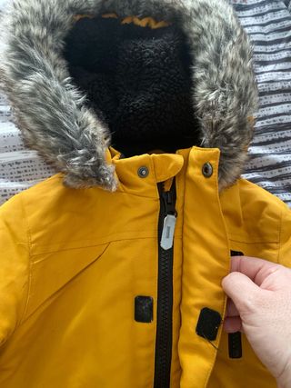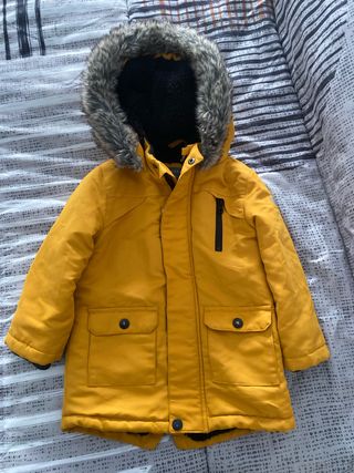 Chaqueta de abrigo en color amarillo, ideal para los meses más fríos. Cuenta con un forro interior cálido y una capucha con pelo. - Cierre de cremallera y botones. - Dos bolsillos delanteros con botón. - Puños ajustados.