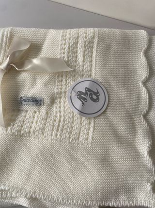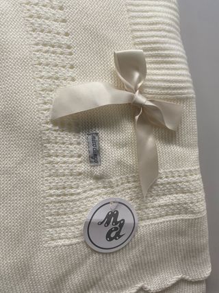 Arrullo de punto en color crudo, perfecto para envolver al bebé con suavidad. - Tejido de punto suave. - Detalle de lazos de satén. - Incluye etiquetas originales.