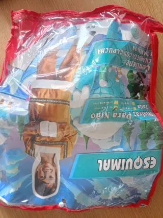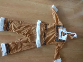 Disfraz de esquimal en color marrón, ideal para niños de 5 a 6 años. El traje tiene detalles decorativos en blanco y negro. - Mangas y bajos con ribete de pelo blanco. - Cinturón de pelo blanco. - Adorno de cinta con estampado geométrico en mangas y piernas.
