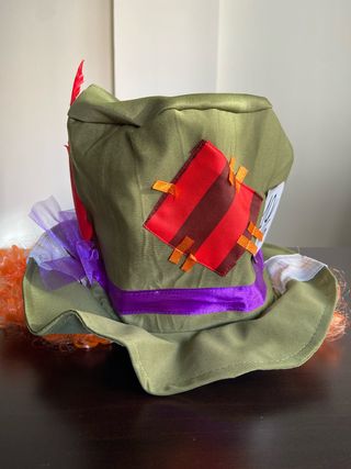 Disfraz de sombrerero loco con un diseño divertido y original. Incluye: Sombrero, Chaqueta con falda camisa y Pajarita y Pantalón. El sombrero se modificó para añadir el pelo y otros detalles.