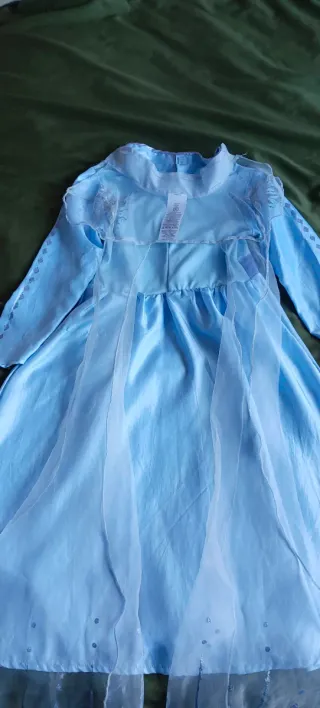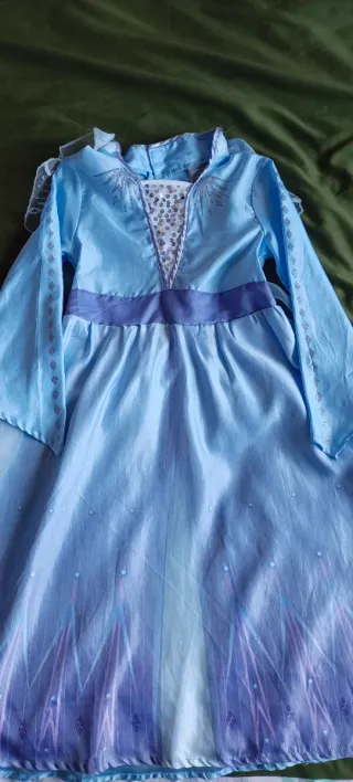Disfraz de Elsa de Frozen, perfecto para fiestas o juegos. - Vestido azul brillante con detalles plateados. - Mangas transparentes con copos de nieve. - Dos puezas: capa y vestido