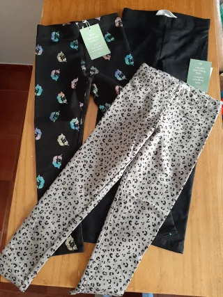Nuevos con etiqueta. Lote de tres leggings con cepillo interior para niña de la marca H&M, talla 4-5 años. De algodón y elastano. Con cintura ajustable con goma y botones. - Unos leggings negros con estampado de unicornios. - Unos leggings negros lisos. - Unos leggings marrones con estampado de leopardo.