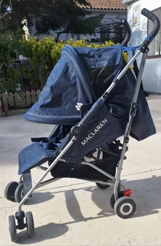 Cochecito de paseo para bebé con un diseño moderno en tela vaquera. - Asiento acolchado. - Arnés de seguridad de 5 puntos. - Capota. - Ruedas delanteras giratorias.