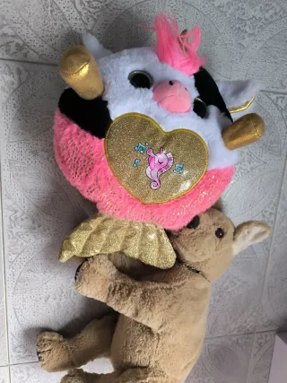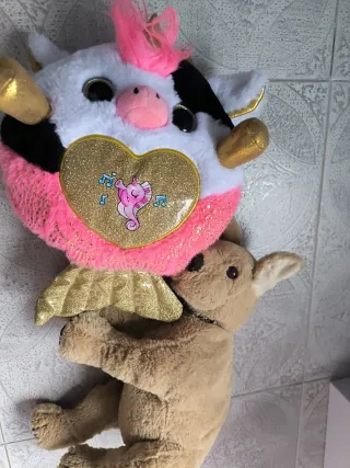 Peluche Rainbocorns en perfecto estado, como nuevo. Regalo peluche perro nuevo pero con mancha de slime - Diseño de vaca con detalles de unicornio. - Corazón brillante con figura de caballito de mar. - Alas doradas y detalles en rosa y negro.