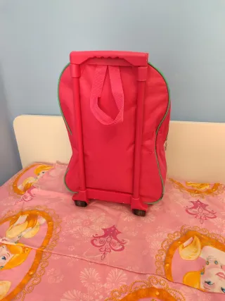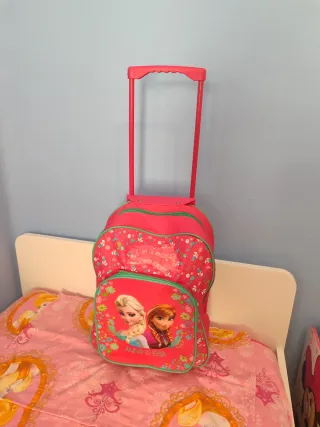 Mochila escolar con ruedas de Frozen, ideal para los más pequeños. Presenta un diseño llamativo y práctico. Está en perfecto estado con pequeños signos de uso normal . - Personajes: Anna y Elsa. - Color: Rosa. - Material: Textil.