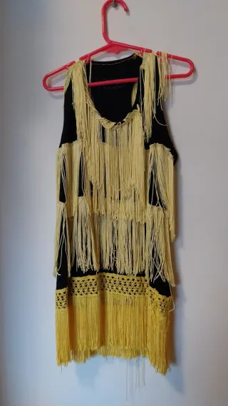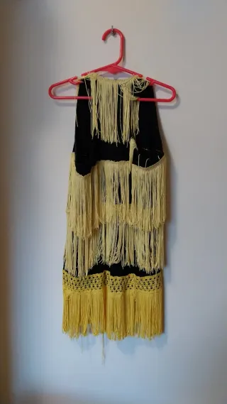 Disfraz estilo Charleston con un diseño llamativo en negro y amarillo. Talla 5-6 años - Adornado con múltiples capas de flecos. - Detalle de crochet en la parte inferior. - Ideal para fiestas temáticas o eventos.