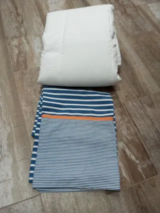 Conjunto de edredón y funda para cuna con un diseño de rayas. Edredón blanco. Funda con rayas azules y una franja naranja. Dos mantitas de regalo( última foto)