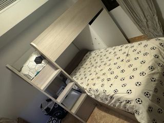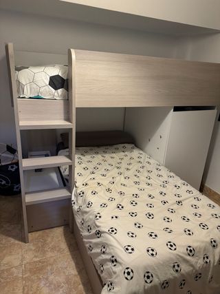 Cama tren infantil con armario y cajones, ideal para habitaciones de niños. - Estructura de madera. - Armario integrado. - Cajones de almacenamiento. Aprovecha muy bien el espacio ⚠️ Detalle: Una de las tablas interiores se partió y la arreglamos (ver última foto). No afecta al uso. Precio rebajado por este motivo. Se vende por mudanza
