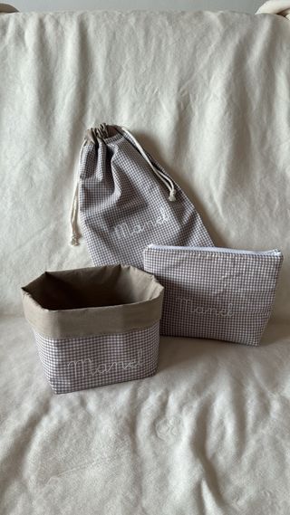Conjunto de tres piezas de tela con estampado de cuadros. - Incluye una bolsa con cierre de cordón. - Un neceser con cremallera. - Una cesta organizadora. - Bordado con el nombre Manel en cada pieza