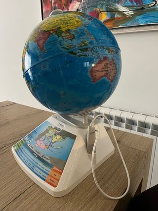 Globo terráqueo interactivo de Oregon Scientific con mapa de España en la base. - Incluye mapa de España en la base. - Botones de PAUSA, +VOLUMEN-, REPETIR y ENCUENTRA. - Opciones de búsqueda: Continentes, Capitales, Continente, Nombre, Capital, Población, Área, Moneda, Historia, Name, Capital, Population, Países, Desafío Final, Características, Geografía, Idioma, Punto Más Alto, Nacional, Curiosidades, Datos, Currency, Area, Language. - Botón COMPARA con opciones de Área y Población.