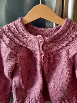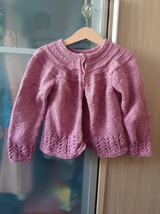 Chaqueta de punto para niña de 2 a 3 años. Hecha a mano. - Color rosa con hilo brillante. - Diseño con cuello redondo. - Cierre de botones. - Detalle de puntilla en el bajo y puños.