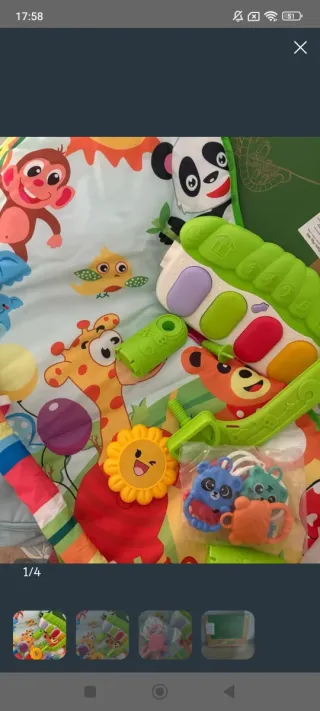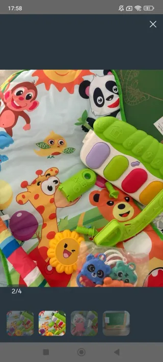 Marca Yookidoo, con juguetes extra comprados aparte. Manta acolchada para jugar en posición supina, posición prona y sentado. Viene con todo lo original más algunos juguetes colgantes adicionales. Precio original: 85 EUR