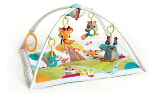 Manta de actividades para bebés de la marca Tiny Love, con un diseño inspirado en la naturaleza y animales del bosque. - Incluye varios juguetes colgantes. - Colchoneta acolchada. - Arco de juegos. - Diseño con ciervos, ardillas y otros animales.
