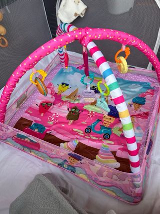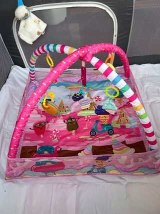 Alfombra de juegos para bebés con un divertido diseño de helados y dulces. - Colchoneta acolchada. - Incluye arco con varios juguetes colgantes. - Colores vibrantes y alegres.