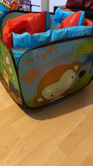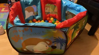 Divertida piscina de bolas para bebés con un alegre diseño de animales y temática de aventura. - Incluye numerosas bolas de colores. - Estructura inflable con laterales de tela. - Ventanas para ver el interior.