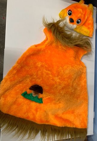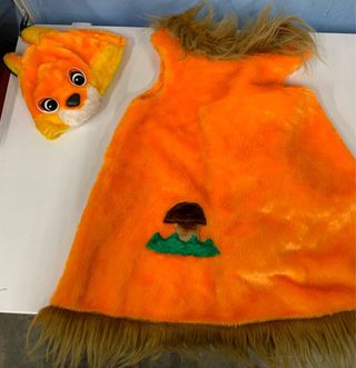 Disfraz de ardilla para niños de 3 a 6 años. Incluye un gorro con orejas y un chaleco vestido con detalles. - Material suave y naranja. - Gorro con cara de ardilla. - Vestido con pelaje marrón en el cuello y borde inferior, y la cola. - Detalle de seta y hierba en el vestido! - Recien lavado