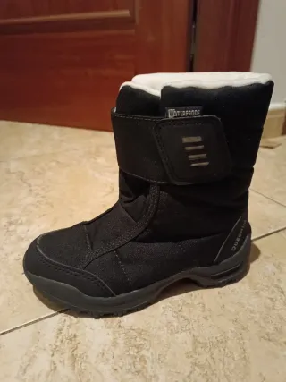 Botas de nieve infantiles de la marca Quechua, ideales para mantener los pies calientes y secos. - Color negro. - Cierre de velcro. - Forro interior blanco. - Suela de goma. - Detalle WATERPROOF en el lateral. Estsn completamente nuevas, las ha usado una vez. Talla 31.
