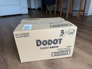Caja de pañales Dodot, talla 3, para bebés de 6 a 10 kg. - Contiene 3 paquetes de 62 pañales cada uno. - Total de 186 pañales. Vendo junto o separado. He abierto la caja para poder hacer foto del interior y que se vea la integridad del paquete y que estan sin abrir.