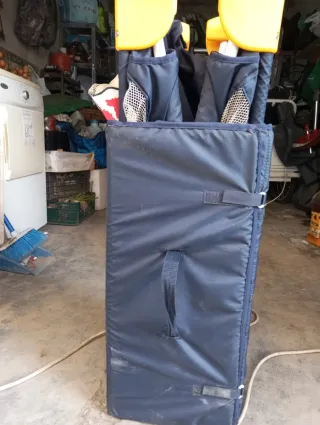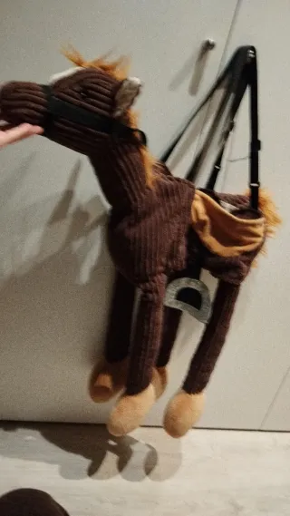 Disfraz de caballo infantil, ideal para fiestas o juegos. Se puede usar solo, o como complemento. Se cierra con velcro. En muy buen estado. - Material de pana marrón. - Diseño de peluche con crin y cola. - Incluye correas regulables para llevar colgado. - Patas colgantes. - Ideal desde los 2/3 hasta los 6/7 años. - Talla única, la altura se regula con las correas.