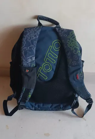 Mochila escolar Totto en color azul marino con detalles en verde. Está bastante bien, aunque con algún pequeño signo de desgaste (en la parte trasera de una asa tiene una pequeña muesca). - Diseño con estampado. - Asas y parte trasera acolchadas. - Tiene 4 compartimentos: 2 amplios, 1 mediano y 1 más pequeño (bolsillo frontal). - Bolsillos laterales de malla para botellas. - Incluye llavero con el logo de Totto.