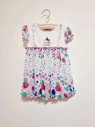 Vestido blanco para niña con estampado de círculos de colores y un dibujo de gatita. Nuevo a estrenar - Talla 3 años. - Mangas abullonadas. - Cintura elástica. - Estampado de círculos multicolor.