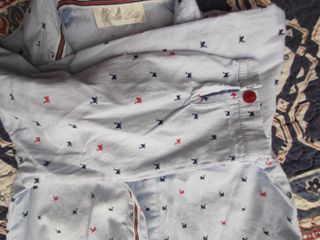 Conjunto de dos piezas para niño, ideal para ocasiones especiales o uso diario. - Camisa de manga larga azul con estampado. - Pantalón corto rojo con detalles. - Cierre de botones en la camisa.