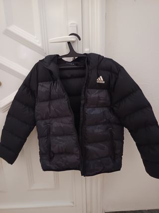 Chaqueta acolchada de Adidas para niño. Perfecto estado. Abrigada y muy poco uso. - Color negro con detalles de camuflaje. - Capucha integrada. - Cierre de cremallera.