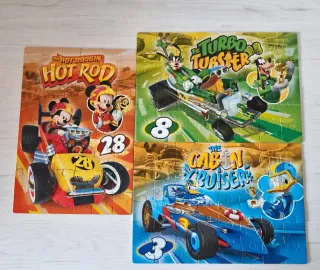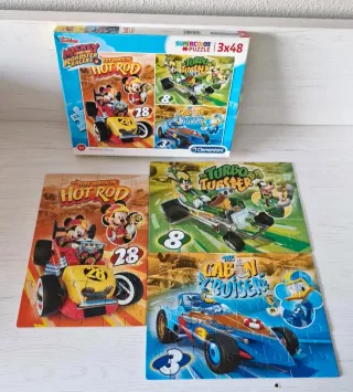 Pack de 3 puzzles de Mickey y los Superpilotos, cada uno con 48 piezas. - Puzzles con licencia oficial de Disney. - Diseños variados de los personajes y sus coches. - Ideal para fans de Mickey y las carreras.
