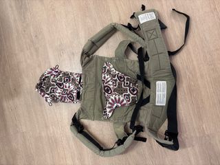 Portabebés ergonómico Manduca en color verde militar y con un estampado floral en tonos burdeos y beige. - Capucha integrada. - Tirantes acolchados.