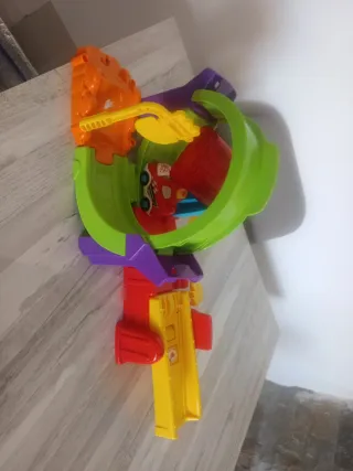 Divertido circuito de coches para horas de juego. - Pista de múltiples niveles. - Incluye rampas y curvas. - Colores vibrantes: amarillo, azul, morado y rojo.