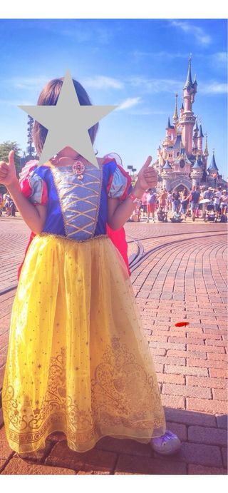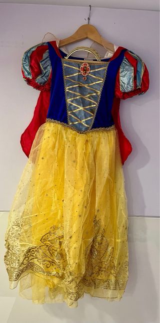 Disfraz de Blancanieves de Disney original comprado en la tienda oficial Disneyland. - Vestido con detalles dorados. - Mangas abullonadas. - Incluye capa roja. - Incluye corona