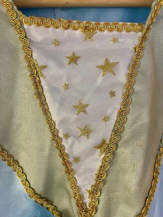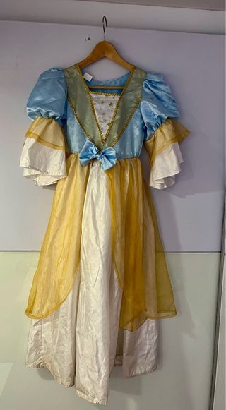 Disfraz de princesa para niña, talla 120-130 cm. - Mangas abullonadas en azul claro. - Cuerpo con detalles dorados y estrellas. - Falda larga en capas de color blanco y dorado. - Lazos decorativos.
