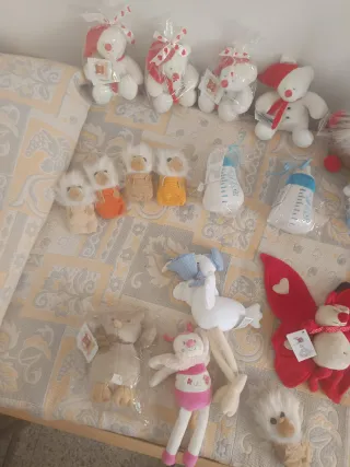 Conjunto de peluches variados, ideales para regalar o decorar. - Peluches con temática de bebé, incluyendo biberones. - Figuras navideñas como muñecos de nieve y un gnomo. - Adornos en forma de mariposa con detalles de corazón.