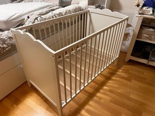 Vendo cuna Sundvik blanca de segunda mano en buen estado. Tamaño 120x60 cm. Se entrega desmontada e incluyo gratis una barandilla de seguridad para cuando se transforma la cuna en cama. Tengo dos iguales, se venden juntas o por separado. SOLO RECOGIDA EN PERSONA, NO SE HACEN ENVÍOS