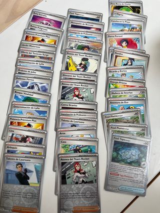 Lote de cartas de Entrenador Pokémon. - Reloj Extraño - Ruinas Peligrosas - Potencia Prémium Plus - Jardin Misterioso - Oferta del Teniente Surge - Determinación de Lylia - Órdenes de Jefes - Defensor Férreo - Bosque Vitalidad - Fósil Tapa - Monopatín de Rescate - Investigación de Profesores - Guía de Exploración - Protón del Team Rocket - Giovanni del Team Rocket - Atenea del Team Rocket - Cueva Granito - Talento de Laureano - Liza - Aroa - Cass - Arlequín - Pesa Recia de Cintia - e-Nigma - Cancha en la Playa - Dama Parasol - Kendra - Ricardo y Enrica - Energía Prisma - Muñeco de Snorlax - Aventura de Eco - Fósil Pluma Antiguo - F