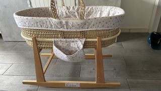 Moisés de palma acolchado de Cambrass. Su diseño cuidadosamente elaborado ofrece tanto comodidad como funcionalidad para satisfacer las necesidades de tu pequeño durante este período crucial de crecimiento. Fabricado con una base de mimbre, este moisés proporciona una superficie sólida y estable para el descanso de tu bebé. Viene completo con un colchón, una suave colcha y una vestidura.