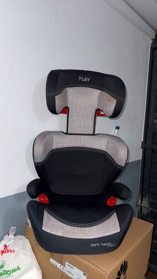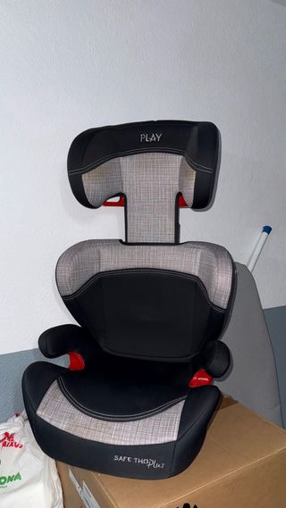 Silla de coche infantil de la marca PLAY, modelo SAFE THO PLUS. - Diseño moderno con detalles en gris y negro. - Reposacabezas ajustable. - Acolchado para mayor comodidad.