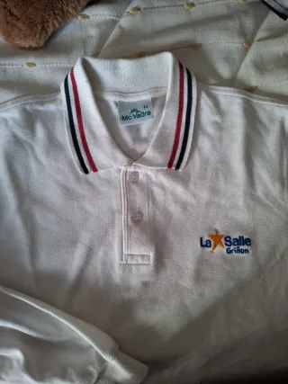 Polo de manga larga en color blanco, con cuello de canalé a rayas rojas, negras y blancas. Presenta un pequeño bolsillo en el pecho y cierre de dos botones. - Logo bordado de La Salle Grillon en azul y naranja. - Etiqueta interior Mc Yaura. Talla 12 y de manga larga
