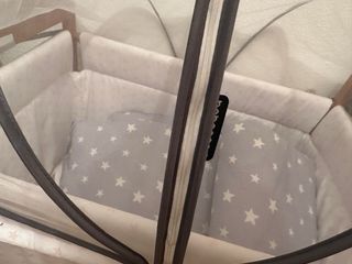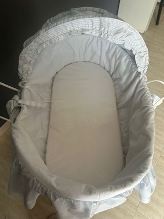 Mosquitera para minicuna con un diseño de estrellas grises y blancas. Protege al bebé de insectos y gatos. Comprada en diciembre. Se vende porque a mi hija no le gusta la minicuna. - Tejido de malla transpirable. - Cremallera frontal para fácil acceso. - Pequeñisimo enganche que se ve en las fotos.