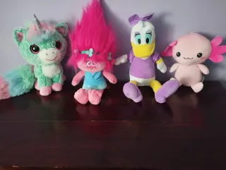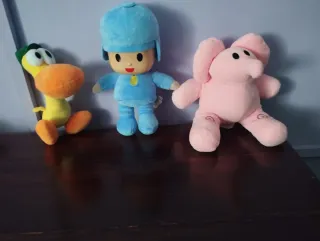 Conjunto de tres peluches de personajes infantiles. - Peluche de Pocoyó con gorro azul. - Peluche de Pato amarillo y naranja. - Peluche de elefante rosa. 8 euros cada uno