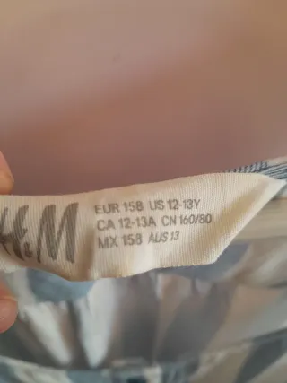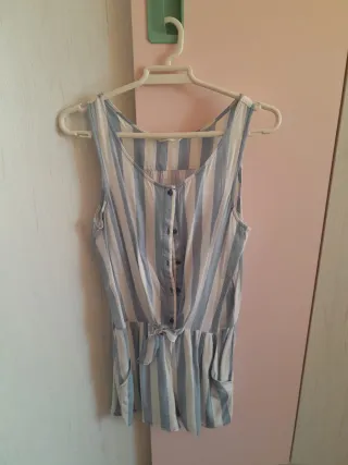 Mono corto de rayas blancas y azules, ideal para el verano. Tiene un cinturón para anudar en la cintura y bolsillos laterales. - Talla 12 años. - Diseño de rayas verticales. - Cierre de botones en la parte delantera. - Cinturón de tela para ajustar. - Dos bolsillos funcionales.