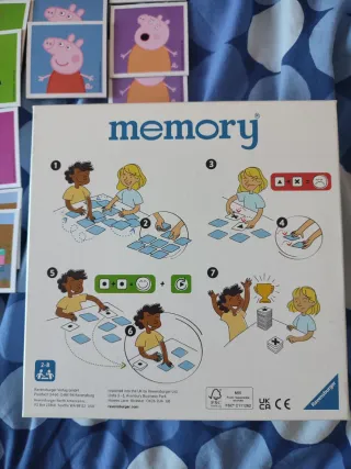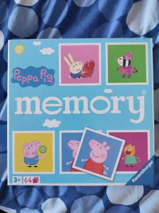 Juego de memoria clásico con los personajes de Peppa Pig. Ideal para los más pequeños. -Falta una tarjeta,en la última foto la carta fucsia con la gatita naranja le falta la pareja - Incluye 64 tarjetas. - Recomendado para mayores de 3 años. - Fabricado por Ravensburger.
