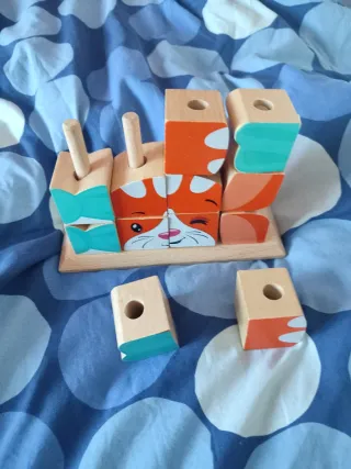 Divertido puzzle de madera con bloques para armar. - Piezas de madera. - Diseño de gato. - Base de madera.
