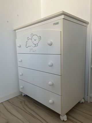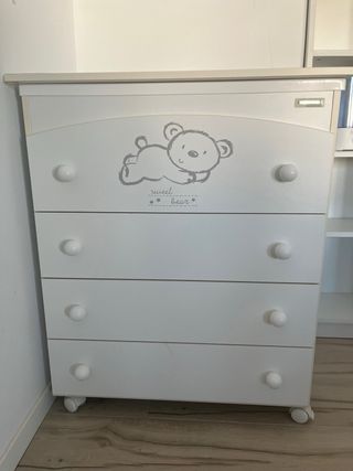Cómoda blanca con diseño de osito sweet bear y ruedas. - Cuatro cajones amplios. - Tiradores redondos blancos. - Ruedas para facilitar el movimiento. - Bañera incorporada con desague
