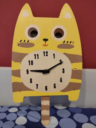 Original reloj de pared con diseño de gato. -Se le mueven los ojitos y la colita - Fabricado en madera. - Tonos amarillos y marrones. - Esfera con números negros.