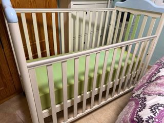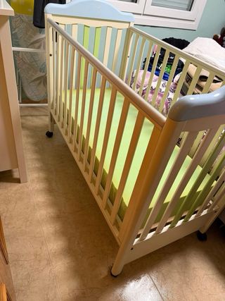 Cambio por paquete de pañales grande talla 5 de mercadona. cuna de madera, la espuma yo la he estado usando para que el colchón no quede tan abajo y acceder mejor al bebé, la barrera de uno de los lados se baja. Tiene ruedas y también se puede poner con unas maderas que trae con balancín. La entrego desmontada en Carranque.